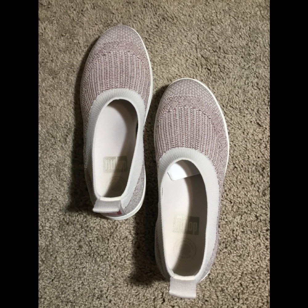Uberknit slip on ballerina FitFlop in stone/rose gold metallic color, size 6.5 in almost new condition. The color is like a blush pink with a tiny bit of sparkle woven throughout the shoe. I’ve worn these approximately 4 times, so they are in great condition.