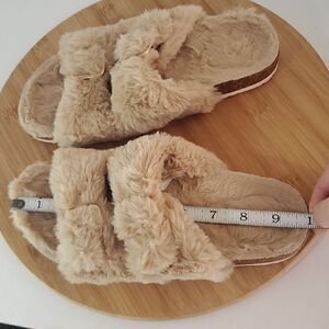 Fitory Faux Rabbit Fur Open Toe Slippers Cork Slide Sandals Beige Women's Size 7