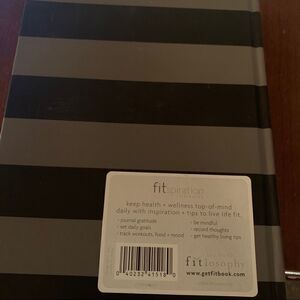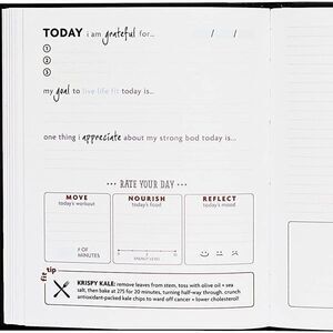 Motivational fitness journal features tips for a healthy lifestyle, inspirational quotes, and space to record thoughts, ideas, and goals.