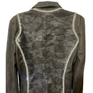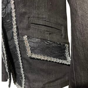Fitted Black Denim Blazer Jacket S/M Floral Lace Embellished Sequined Bling Art