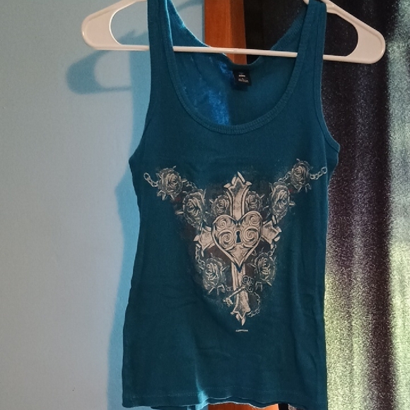 This fitted blue tank top features a sleeveless design, perfect for warm weather. The elegant embellishment on the front adds a touch of sophistication to this casual top. Ideal for both casual outings and stylish gatherings.