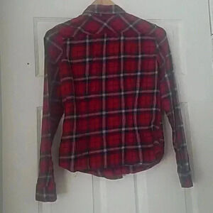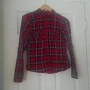 This red white and blue flannel button down is perfect for layering in the fall or tying up in the summer. 100% cotton and very comfy. Blue buttons to accent. Gently used.