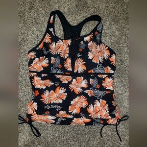 This vibrant swim tank top features a striking floral pattern in orange and black, perfect for making a splash. The fitted design with a tie front adds a stylish touch, while the sleeveless cut ensures comfort and freedom of movement. Ideal for swimwear, this top combines fashion with functionality.