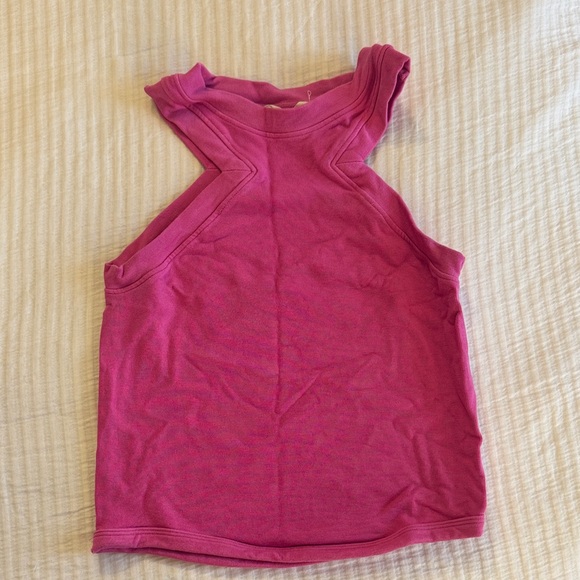 Magenta racerback tank with a high neckline and streamlined seaming. Lightweight stretch fabric for comfortable all-day wear. Slim, flattering fit that layers easily for casual or active looks.