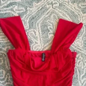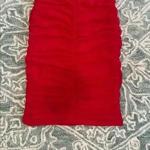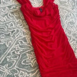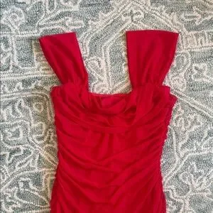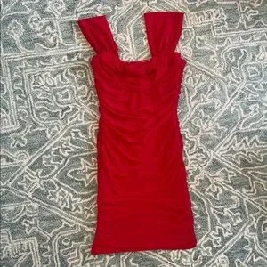 A bold red ruched mini dress with a flattering square neckline and wide shoulder straps. The fitted silhouette sculpts the body while gathered detailing adds texture and movement. Ideal for nights out and special events, this dress makes a confident statement. Size medium stain on the bottom back of the dress