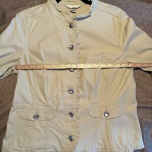 Elevate your wardrobe with this stunning Christopher and Banks fitted jacket. The beige khaki color provides a neutral base, while the clear rhinestone gem button-up closure adds a touch of glamour. Perfect for a preppy look, this jacket is a versatile piece that can be dressed up or down.
