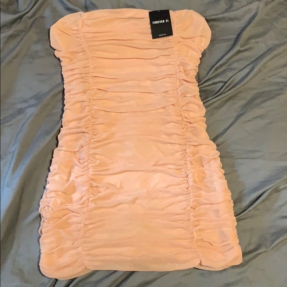 A fun blush, mesh dress that is fitted with ruffled all the way down the dress