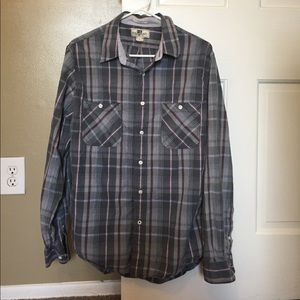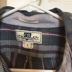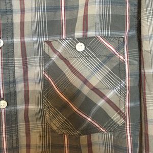 Size large fitted shirt from Club Room. This flannel patterned shirt has hints if different grays, maroon, and white. The shirt had two front pockets and white with a hint of a shine buttons