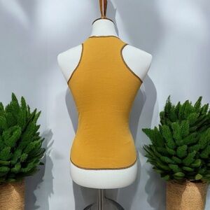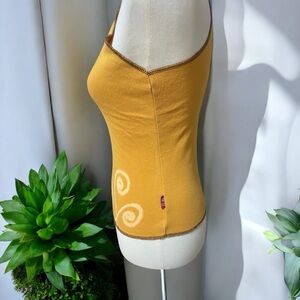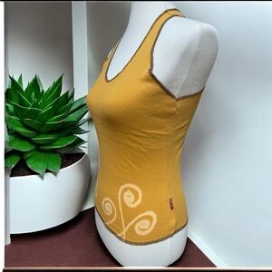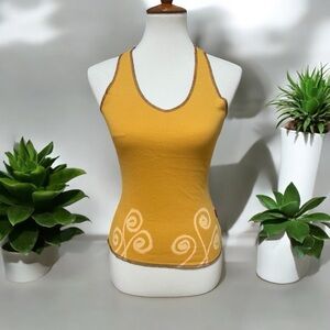 This racerback tank top features a fitted design with a scoop neckline and an ornate cream pattern at the hem. The sleeveless style and wide shoulder straps offer a chic and comfortable fit, perfect for any casual occasion. Tank was purchased in Thailand.