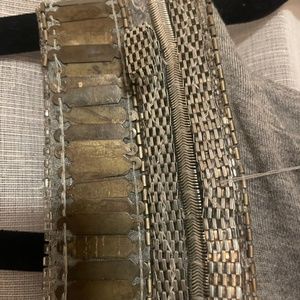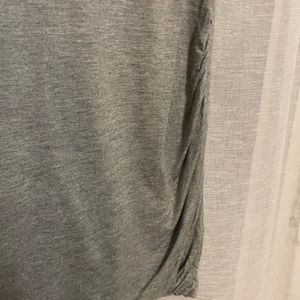 Grey fitted dress with side ruching, metallic embellishments near shoulders with a few beads missing/duscomnectex.
