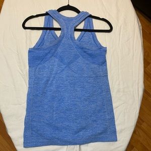 Light and form fitting blue workout top. Only worn a couple times but looks brand new with no imperfections. I absolutely love the way this fits me and although the color is adorable, I don’t think it suits me well. Size Large