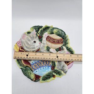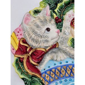 Fitz And Floyd Christmas Cat Kitty With Christmas Tree Ornaments Canape Plate