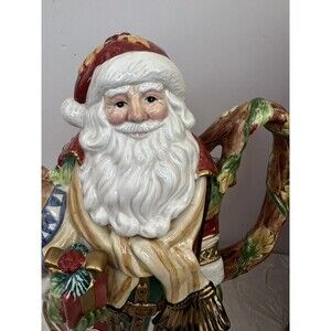 The product is a Fitz And Floyd Solstice Santa Christmas teapot, handcrafted in 2005. It is large in size, featuring a multicolor design with a Santa theme. Made of ceramic with a glossy finish, this teapot was manufactured in China. It comes in a new open box.