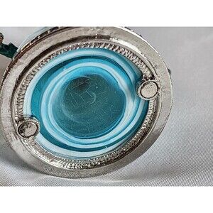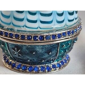 Blue with snowflakes and swirls. Small spot inside base, see pics. No missing stones. No chips. Does not include box.