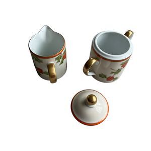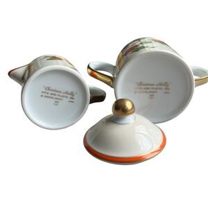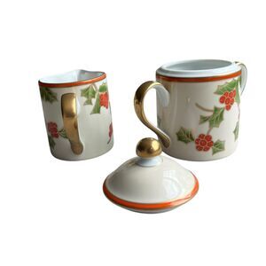 Beautiful vintage porcelain creamer and lidded sugar bowl from Fitz and Floyd’s Christmas Holly collection. Features red holly berries, green leaves, and gold handles with an orange rim. Perfect for holiday entertaining or display.