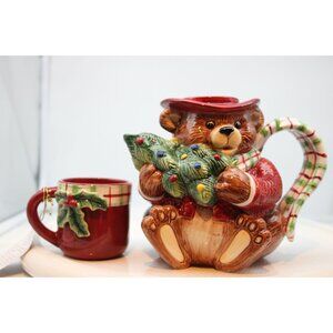 Charming Fitz & Floyd Christmas Snack Therapy Bear Teapot & Cup set, perfect for holiday tea rituals. Adorable bear design adds festive cheer, ideal for collectors and gift-giving.