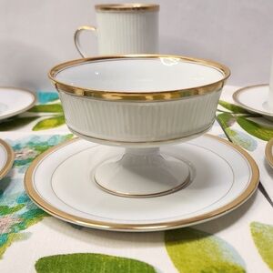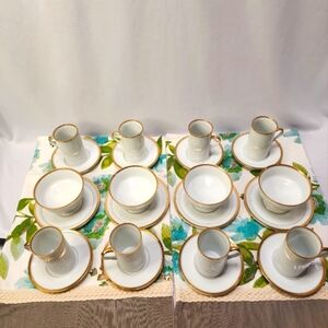 Pattern: Classique d'Or Buff by Fitz & Floyd. This elegant coffee or tea set features a classic design with gold trim, perfect for any dining occasion. The set includes 7 beautifully crafted cups and saucers with 4 matching dessert dishes and saucers. 1984 - 1996