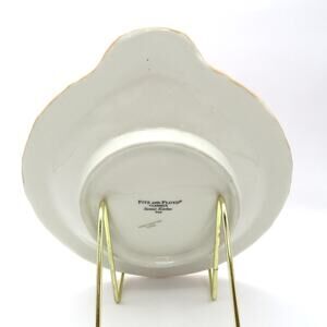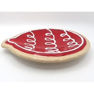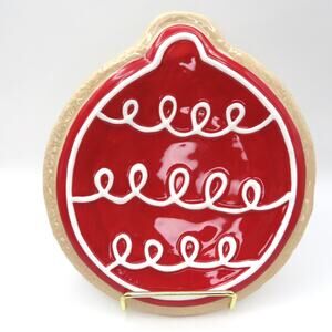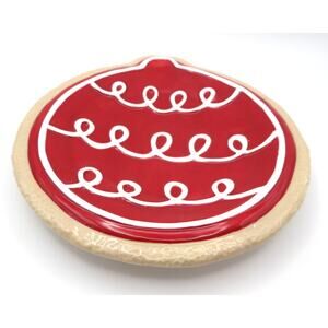 This Fitz and Floyd Santa’s Kitchen ceramic platter features a charming ornament shape with festive red and white icing-style detailing. Part of the beloved Fitz & Floyd Classics line, this hand-crafted platter is perfect for holiday cookies, serving treats, or adding a bright seasonal accent to your Christmas décor. A great addition for collectors or anyone who loves nostalgic 1990s Fitz & Floyd holiday pieces.