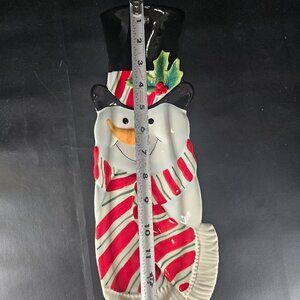 A Fitz and Floyd Snack Therapy Snowman server tray/platter/wall hanging in original box. This item is part of the Snack Therapy Collection by Fitz and Floyd, a brand known for its ceramic and porcelain products. The server features a whimsical hand painted snowman design. Depicting a snowman in a tall Black Hat and a red white striped scarf. This particular plate has two holes in the back, so you can also hang it up as holiday wall decor. It is marked on the backside Fitz and Floyd Essential Snack Therapy handcrafted China. Recommended to hand wash to preserve the decorative finish. Avoid soaking and abrasives. Measures 13.5 inches long, 5 inches wide. Non-smoking pet free home.