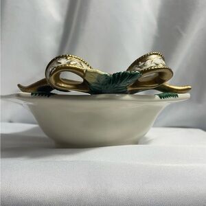 Elegant cream ceramic bowl featuring a festive design with gold accents and colorful decorations. Perfect for holiday decor.