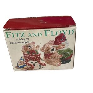 Fitz and Floyd Ceramic Holiday Elf Salt and Pepper Shaker Bears and Santa. These Fitz and Floyd shakers are in great condition. They are about 3 inches end tall. The box is included.