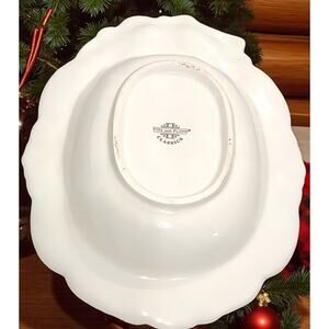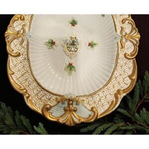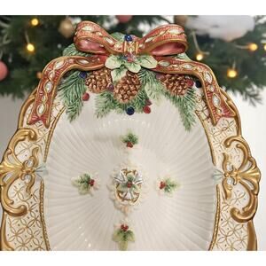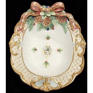 From the beautiful collection "Florentine" from Fitz and Floyd, is this oval serving bowl. Handcrafted of high-quality earthenware and handpainted in stunning colors. This cream colored dish is embossed in gold and light blue and has 3D embellishments. At the top is a red bow with pine needles, holly leaves with red berries, and pinecones. This collection was made from 1999-2002. This stunning piece would be a delightful addition to anyone's holiday season decor. It measures 3.25" tall x 10" long x 8" wide. There is no damage noted whatsoever. Please look carefully at all of the pictures and let me know if you have any questions.