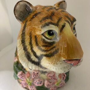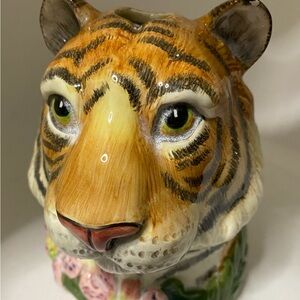 Handcrafted Fitz and Floyd plate. Features the Serengeti design. This amazing Fitz and Floyd Serengeti Tiger is a Toothbrush Holder. This is an awesome display piece. This cat is Handcrafted in China for Fitz and Floyd. This is a discontinued item and is quite unique.A great gift or a wonderful display item, it would also make a great addition to a collection.Measures: Approx: 5 1/2" T x 4 1/4" L and the depth is 5 1/2" from the back of the neck to the tip of the nose. There are 4 holes for toothbrushes.