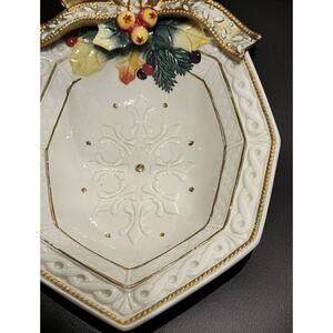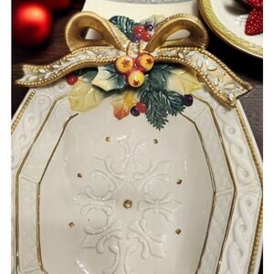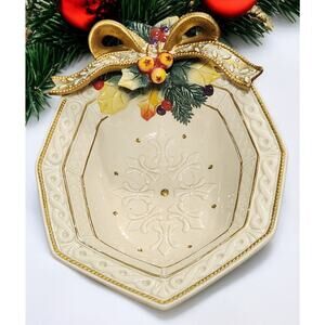 From the Fitz and Floyd Snowy Woods Collection, 1992-2000, is this octagon cranberry serving dish. Made of high-quality cream colored earthenware, the design in the middle is of an embossed snowflake with gold accents. At the top of the bowl is a white and gold bow embellished with cranberries, e evergreen, and holly. Even though this is called a cranberry serving dish, it can be used for several things such as a candy bowl, vegetable dish, etc. It's handpainted and measures 3" tall x 10" long x 7.25" wide. It was made in 1992 in China. There has been a lot of detail and craftsmanship in this, and it would definitely be a beautiful addition to your holiday season decor. Please look carefully at all of the pictures and let me know if you have any questions.