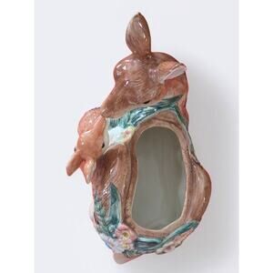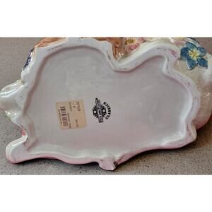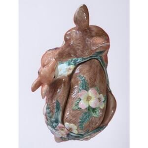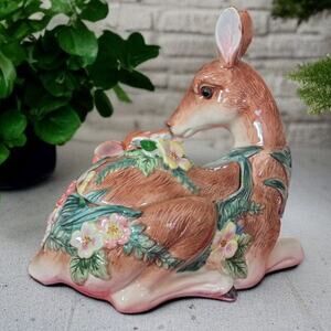 This beautiful Fitz and Floyd figural piece is of a doe and her fawn nestled in floral and leaf accents. They are touching noses. It's from the Woodland Spring Collection 1998.This piece is handcrafted of high-quality earthenware and beautifully handpainted. It measures 8" tall x 9" long x 6" wide. The overall condition is very good with the exception of 1 leaf that's broken off. It was located under one of the flowers on the doe's back and isn't really noticeable (see pictures). Please look carefully at all of the pictures and let me know if you have any questions.