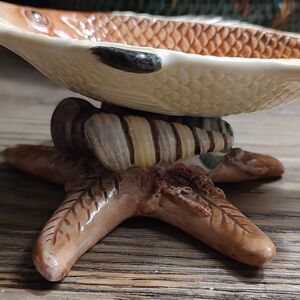 Fitz and Floyd Classics Oceana Line Tartar Sauce Bowl. This unique bowl features a fish atop a starfish and colorful shells pedestal. Fine artistic details can be seen from every angle. Any sauce or dip would look great in this sea inspired bowl. It will be the hit at your next party!
