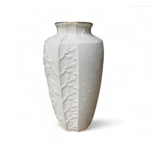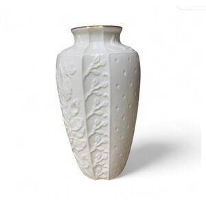 Sculptural elegance awaits with this Fitz and Floyd Essentials vase. A creamy ivory hue sets the stage for intricate botanical details, where sculpted leaves and delicate vines climb the faceted surface. A touch of luxury is added with the gold trim along the rim, offering a sophisticated accent. This vase stands as a testament to understated beauty, bringing a touch of refined nature into your space. Perfect for displaying a fresh bouquet on your dining table, adding a touch of sophistication to your living room