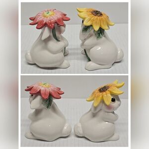 Vintage 2000s Fitz and Floyd Essentials Bunny Blooms Collection Rabbits under Sunflowers Salt and Pepper Shaker Set.