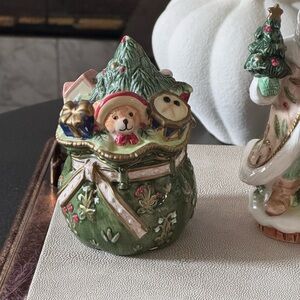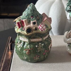Charming Santa figurine with a festive tree. Accompanied by a detailed gift bag with toys. Perfect for holiday decor.