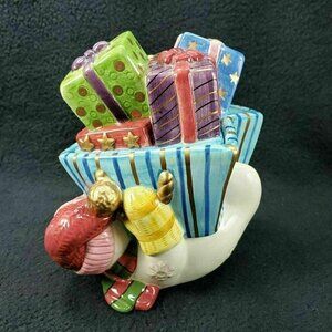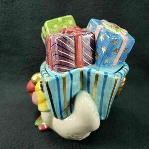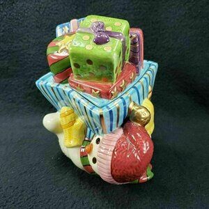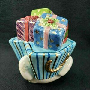 Cute Candy Jar/Trinket Box in traditional and nontraditional Christmas colors. Snowman laying down and holding a large striped blue box with presents on top. Embossed details and gold trim. Retired.