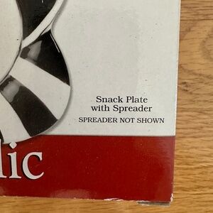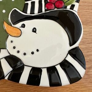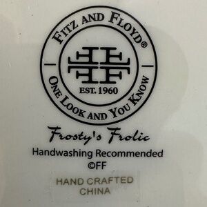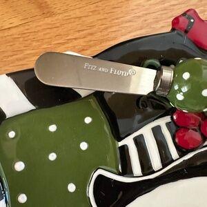 Fitz and Floyd Frosty's Frolic Snack Plate with Spreader with Box. Ceramic snack plate featuring a snowman design, part of the "Frosty's Frolic" collection by Fitz and Floyd. Great for serving a cheese ball or small snacks. "Fitz and Floyd" printed on stainless steel part of spreader. Excellent condition; there are no chips or cracks on the plate or ceramic handle of the spreader. Appears to have never been used. Comes with original box which shows signs of wear. Plate: 6"L X 5.5"H. Length of spreader: 5"