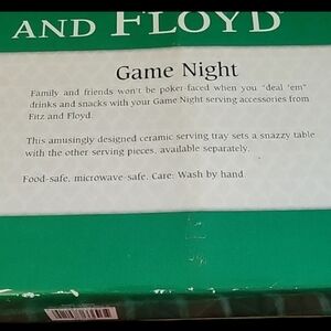 Elevate your game nights with the Fitz and Floyd Game Night Card Tray. Featuring a stylish black and red design, this tray is perfect for game night snacks. Enjoy a touch of elegance and functionality in your home games. Smoke free home