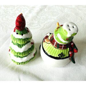 2013 Fitz and Floyd Holly Hat Snowman Christmas Tree Salt & Pepper Shakers Red Bird.
