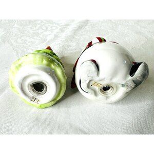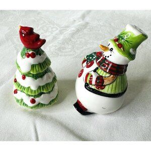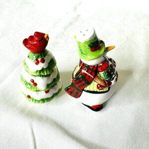 Fitz and Floyd Holly Hat Snowman Christmas Tree Salt & Pepper Shakers Red Bird