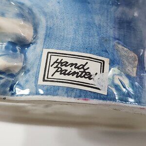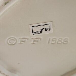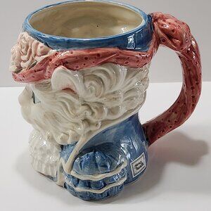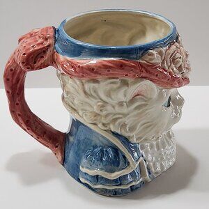 Fitz and Floyd "Kittens of Knightsbridge" Toby Mug, specifically the Cheshire Cat design, produced in 1988. This hand-painted ceramic mug is characterized by its whimsical design, featuring a cat dressed in formal attire with a hat adorned with pink roses. The mug is approximately 5 inches in height and 4 inches wide, excluding the handle. The "Kittens of Knightsbridge" collection is a series of collectible cat-themed items created by Fitz and Floyd, known for their detailed and anthropomorphic designs. Never used, still has paper labels attached.