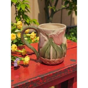 This beautiful mug is from OMNIBUS, a division of Fitz and Floyd. Beautifully handpainted tulips of multiple colors encircle the mug. Around the bottom it's painted brown with a basketweave pattern. The handle is painted green. It's handcrafted of high-quality earthenware and measures approximately 4" tall x 5.25" long. This vintage piece was made in Sri Lanka in 1993. It's in great condition with no damage noted. Please look carefully at all of the pictures and let me know if you have any questions.