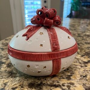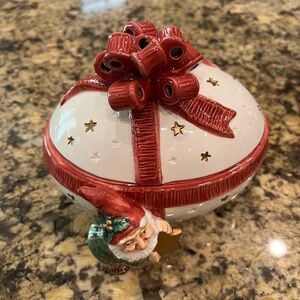 Charming ceramic box with a festive gnome. Red ribbon and white base with gold stars. Perfect for holiday decor.