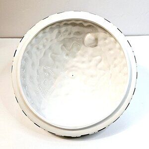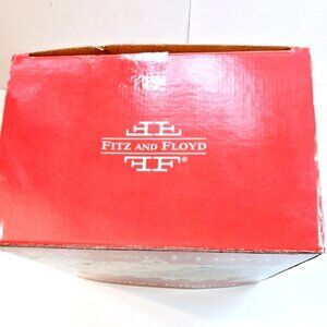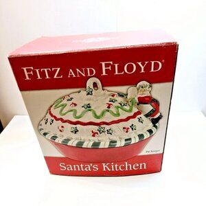 Fitz and Floyd Santa's Kitchen Pie Keeper Brand New Open Box - Never Used. Ships in original box. Santa diving into pie. 8” tall. 10.5” diameter. New condition with no issues or defects. No chips, cracks, crazing. Never used. The box shows some very minor wear. The styrofoam insert that secures the pie keeper in place when in the box is broken in a couple of places and has two pieces missing but this will not affect shipping as I will make sure the item has plenty of padding to keep it safe while in transit..