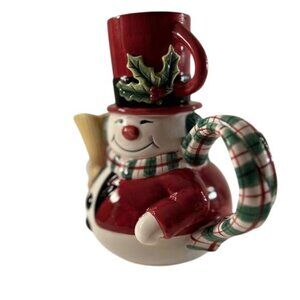 Snowman 2 in 1 pot and cup from Fitz and Floyd Essentials Snack Therapy Collection, This adorable snowman teapot adds charm to holiday decor. Its festive plaid handle, cheerful expression, and vibrant colors make it a standout piece.