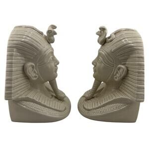 Anchor your bookshelf in style with these vintage Fitz and Floyd bookends. This 1977 set features two striking Egyptian pharaoh heads, possibly Ramses, adding a classic scholarly touch to any room. They have protective foam bottoms to prevent surface scratches. Though hollow, you can fill them with sand for extra weight and stability. A unique and functional piece of decor for any book lover or history enthusiast.