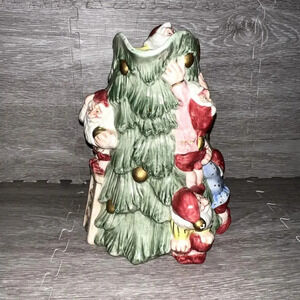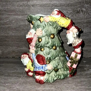 Keywords: Fitz and Floyd pitcher, multicolor ceramic pitcher, hand painted Christmas pitcher, vintage holiday decor, elves Christmas tree pattern, decorative ceramic pitcher, glossy finish pitcher, collectible Christmas pitcher, vintage ceramic pitcher, Christmas tableware, holiday serving pitcher, pre-owned ceramic pitcher, original Fitz and Floyd, Christmas home decor, vintage kitchenware.