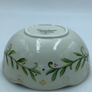 Fitz and Floyd oval ceramic sentiment bowl. The design features the sentiment “Warm Wishes” on both interior sides, scalloped edges, green and red holly berries and rope trim. Pre-owned, good condition.