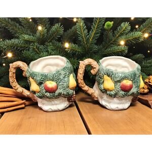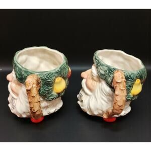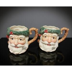This Santa mug set is from the Woodland Santa Collection by Fitz and Floyd. Handcrafted of high-quality earthenware in 1991. Each mug is of Santa's head. They are handpainted and are embossed and 3D. Santa has rosey cheeks and a white fluffy beard, mustache, and eyebrows. His hat is made of green pine needles with yellow pears and red apples in it. On the front of his nature hat is 3 red holly berries. A pinecone is at the edge of his hat where the pom pom would typically be. The handle of the mugs is made to look like brown branches. He measures 4.5" tall. Both have their original FF stickers on them. Made in Taiwan in 1991, this collection is now retired. These vintage mugs are in great condition! Please look carefully at all of the pictures and let me know if you have any questions