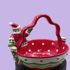 Fitz and floyd ceramic christmas basket with santa claus,stocking stuffer candy dish red and white colors brand new with box.0734