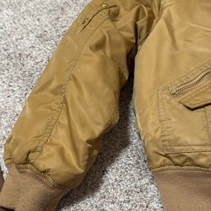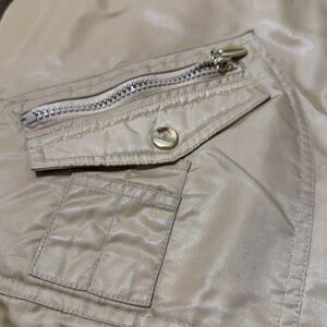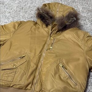 Stylish gold down jacket with a cozy fur-trimmed hood from Fitzroght. Features gold zipper accents and pockets.