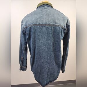 Five Centimetre classic denim blue jeans long sleeve button front shirt with a camouflage green pocket featuring a top zipper above the pocket and corduroy collard. Great to layer or stand alone. Trendy urban wear. Last worn on an actor in a series. 100% cotton. Made in China.